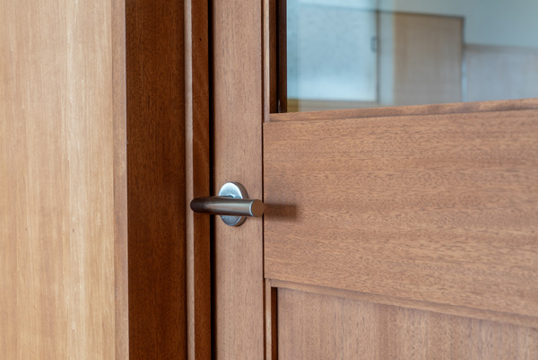 Fさん:プレイリーホームズのドアを語る上で一番の魅力になるのは「ドアそのものの素材の良さ」だと思います。こういったシンプルなドアでよく見られるのは、ドア板に木目調のシートを貼ったもの。賃貸でよく見られるものですね。シートを貼るだけなのでデザインの幅は広がりますが、質感の物足りなさはどうしても拭いきれないんです。